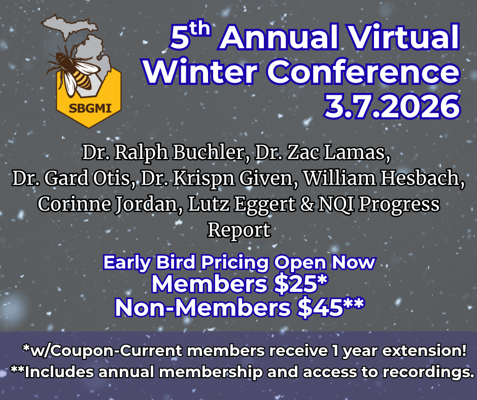 Early Bird Conference Price: $45 (includes annual individual SBGMI membership for new members, access to conference digital recording, 6-month NBH subscription, discounts on ABJ, Bee Culture, Premier Bee Products, ABC Master Academy, Cutler Bee Supply, Napoleon Bee Supply plus more)